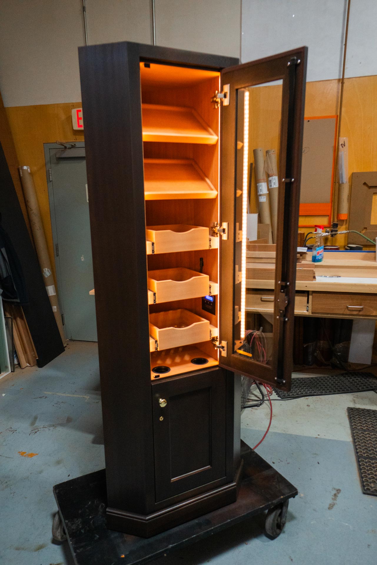 Designed based off previous custom credenza designs, we built this custom humidor for a client in New York. The cabinet features a “lift up” glass lid and leather panels, bordered with upholstery tacks, on the front lower drawers and side panels. Our Guardian 100 Digital Humidification System, housed behind the lower right-hand door, maintains the perfect environment for stored cigars. This humidor includes a variety of cigar storage options within with adjustable shelves and drawers with dividers for loose cigars.