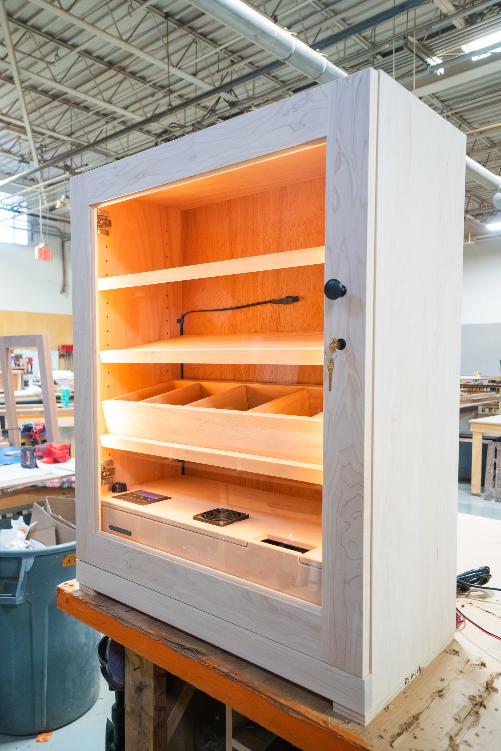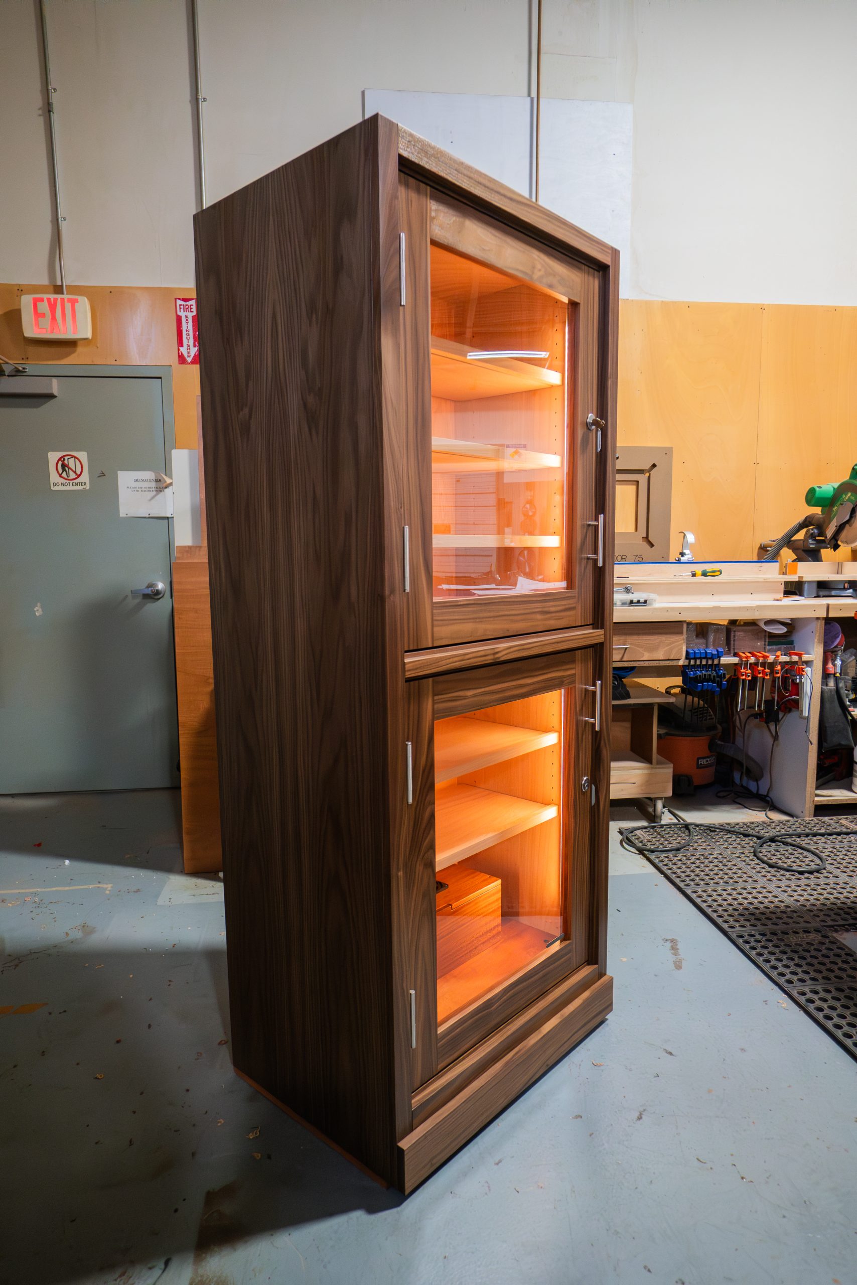 This custom humidor reimagines a familiar silhouette with thoughtful details that make it truly stand out. Equipped with temperature and humidity control, it delivers full oversight of the interior climate for consistent, effortless storage. Burled walnut panels paired with refined trim bring warmth and richness to the piece. A stunning realization of a client’s vision.